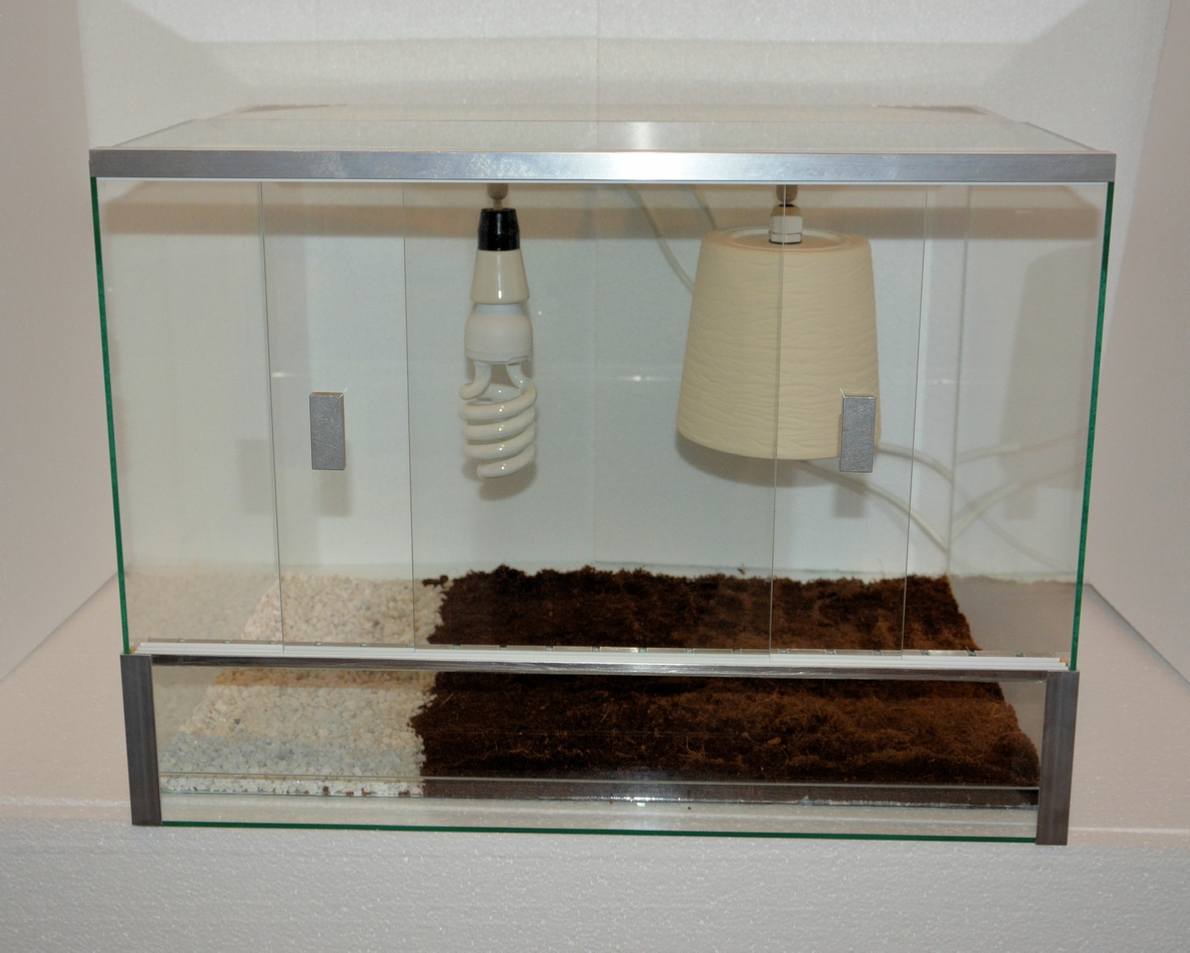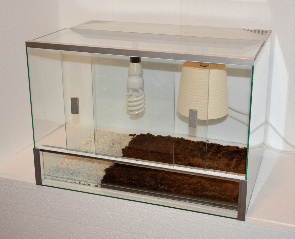 Popis terária : skleněné terárium s dvěma posuvnými předními dvířky, výhřevná žárovka 40W se standardním keramickým krytem, UVB